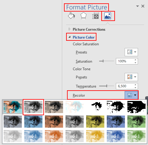 2. The Format Picture dialog box will display in the right pane. Click the Picture button which is the fourth one, and click Picture Color in the drop-down list. Hit the arrow of Recolor and choose the second picture which means Grayscale.
