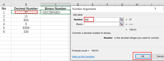 4. Next choose DEC2BIN in the box of Select a function, then click OK.