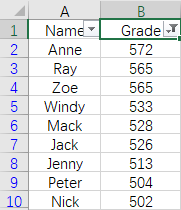 Using the Filter function, you can screen out all the data in your sheet that larger or smaller than a specified value. For example, I want to screen out all the student in this table that got a grade higher than 500.