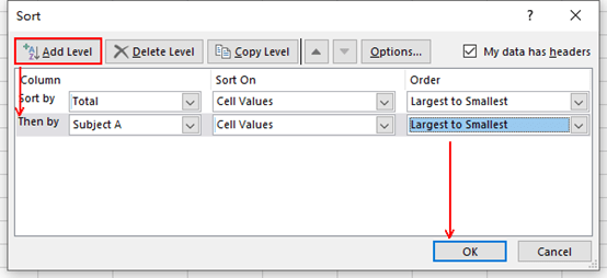 3. In addition to total points, if you want to take a certain subject as the secondary criteria, you can click Add Level to achieve it. For example, here I set it as Then by Subject A, Sort On Cell Values, and in the Order of Largest to Smallest. After all these changes, click OK to implement them.