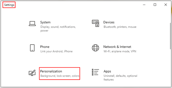 2. The Windows Settings dialog box will display, scroll down and click Personalization.